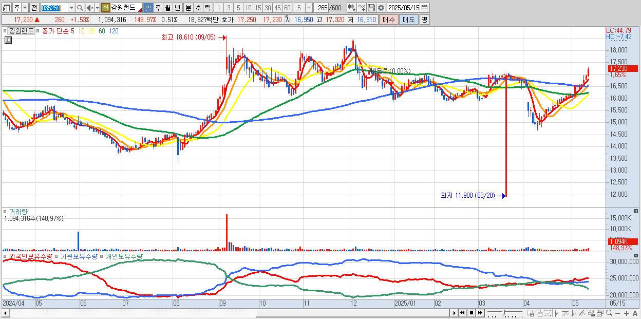 - 강원랜드 (17,270원 ▲ 1.77% , 시총: 36,948억, 외국인 순매수 거래금:90억)