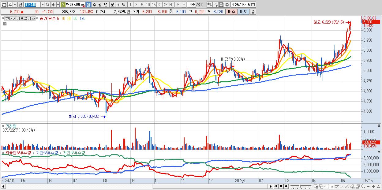 - 현대지에프홀딩스 (6,200원 ▲ 1.47% , 시총: 9,666억, 거래량: 303,599, 거래대금:19억, KOSPI)