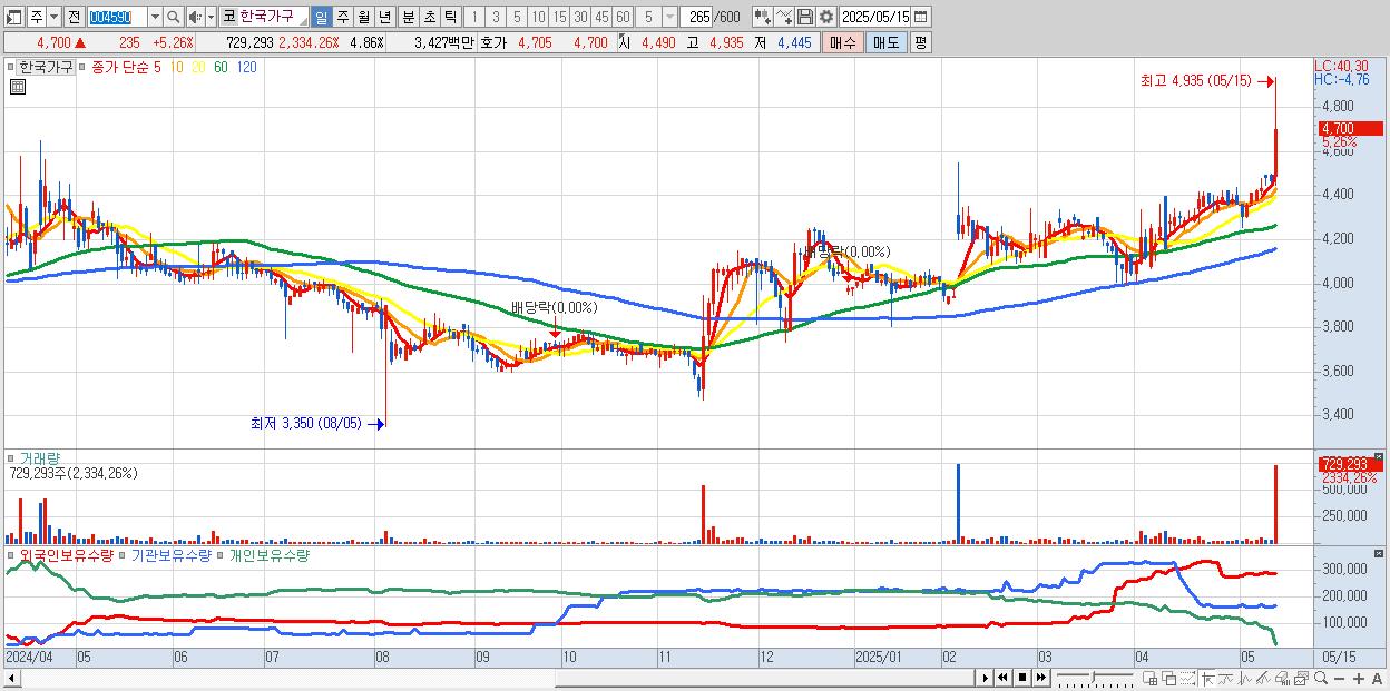 - 한국가구 (4,700원 ▲ 5.26% , 시총: 705억, 거래량: 729,293, 거래대금:34억, KOSDAQ)