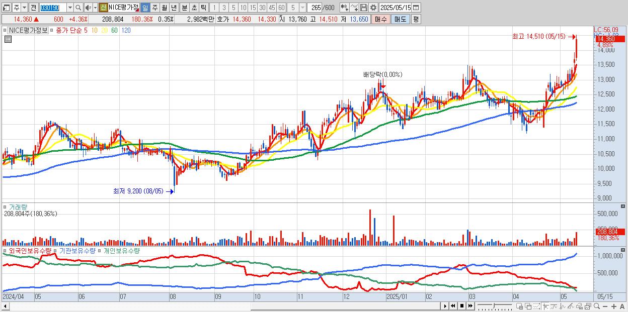 - NICE평가정보 (14,410원 ▲ 4.72% , 시총: 8,575억, 거래량: 176,854, 거래대금:25억, KOSPI)