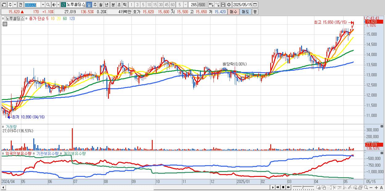 - 노루홀딩스 (15,620원 ▲ 1.1% , 시총: 2,076억, 거래량: 27,019, 거래대금:4억, KOSPI)
