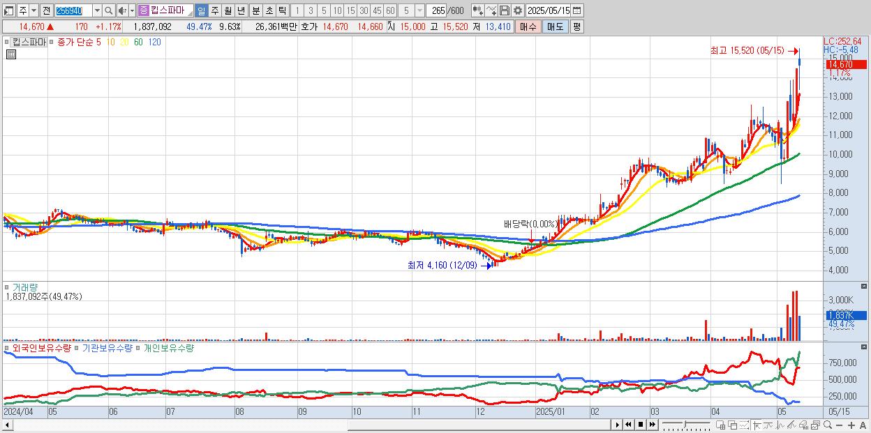 - 킵스파마 (14,670원 ▲ 1.17% , 시총: 2,798억, 거래량: 1,837,092, 거래대금:264억, KOSDAQ)
