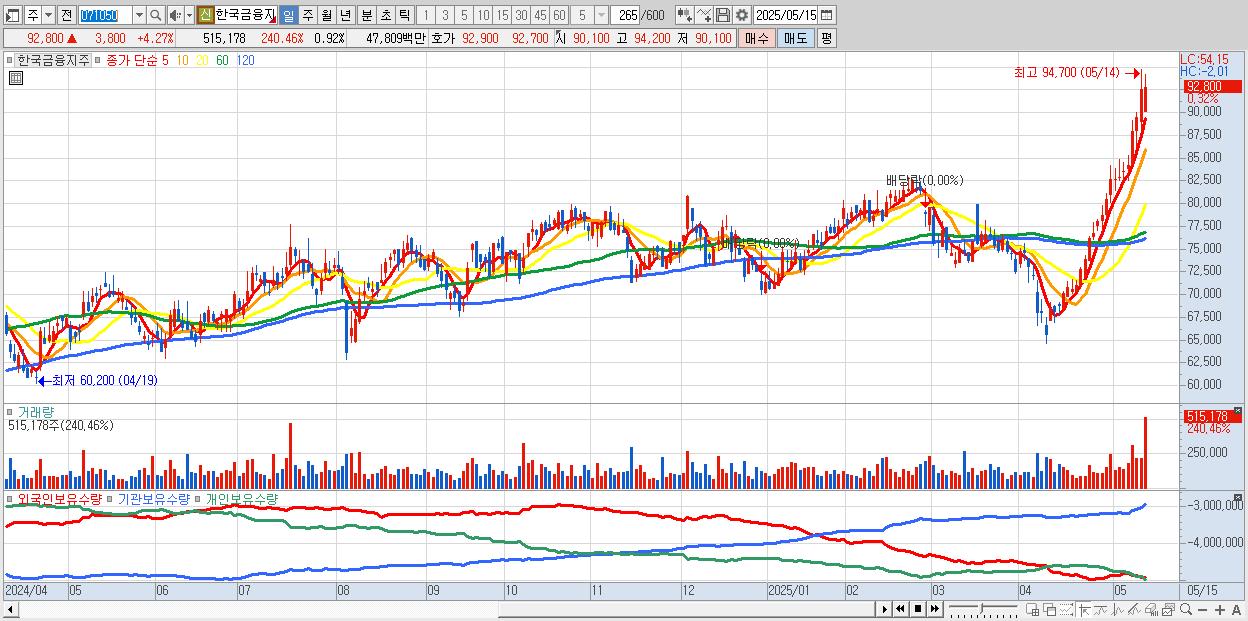 - 한국금융지주 (93,500원 ▲ 5.06% , 시총: 52,104억, 거래량: 450,712, 거래대금:418억, KOSPI)