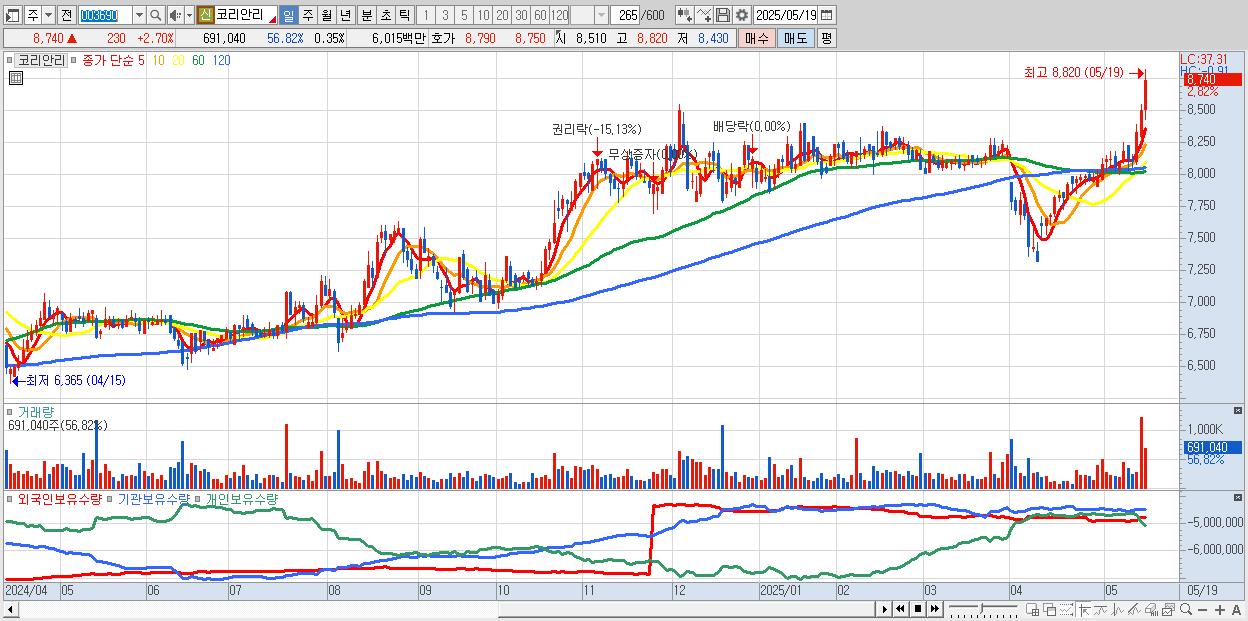 - 코리안리 (8,820원 ▲ 3.64% , 시총: 17,183억, 거래량: 573,274, 거래대금:50억, KOSPI)