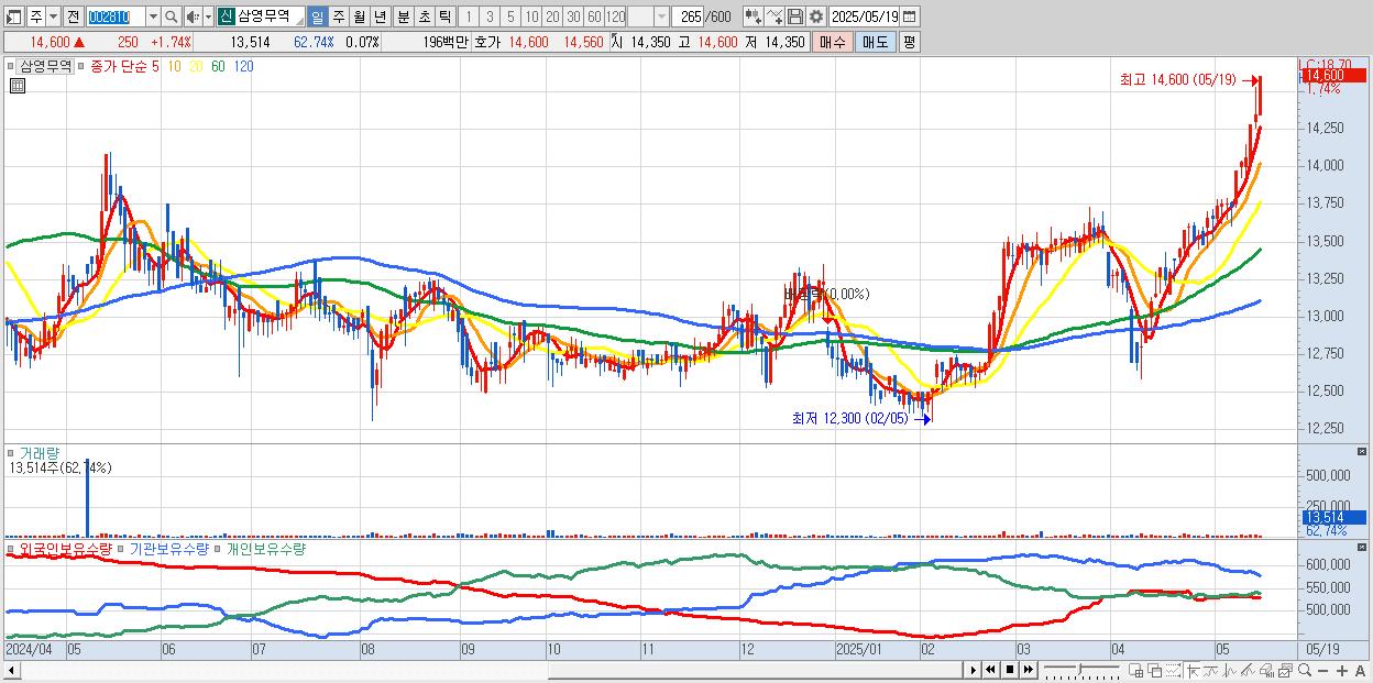 - 삼영무역 (14,600원 ▲ 1.74% , 시총: 2,696억, 거래량: 13,514, 거래대금:2억, KOSPI)