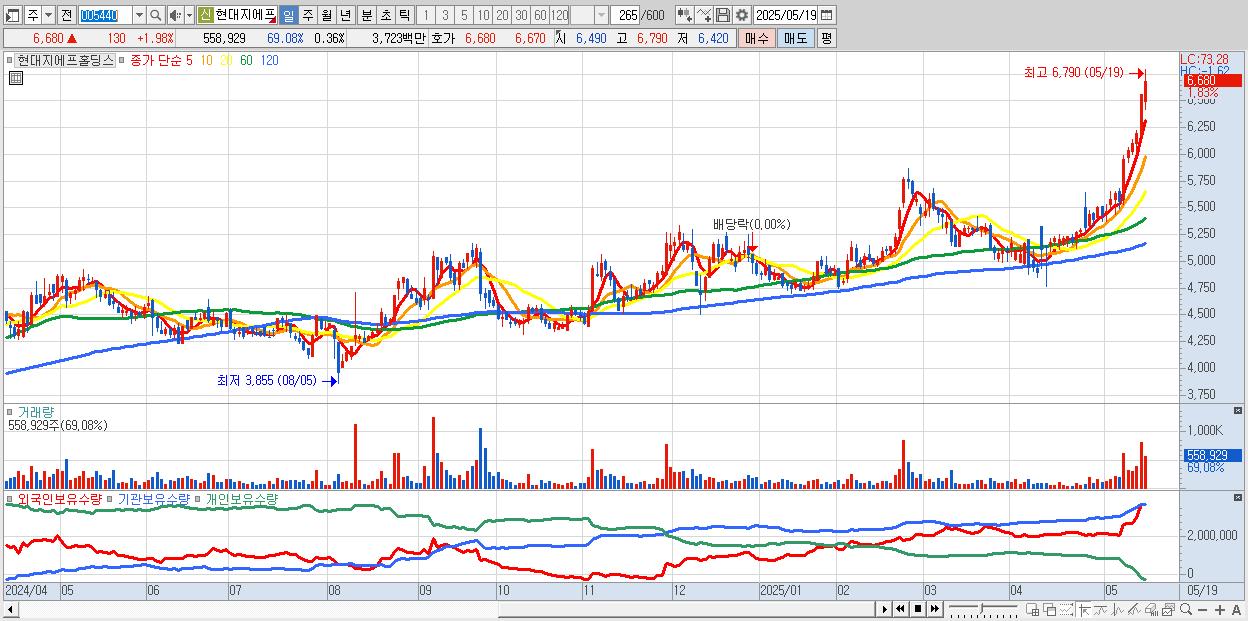 - 현대지에프홀딩스 (6,700원 ▲ 2.29% , 시총: 10,446억, 거래량: 399,625, 거래대금:27억, KOSPI)
