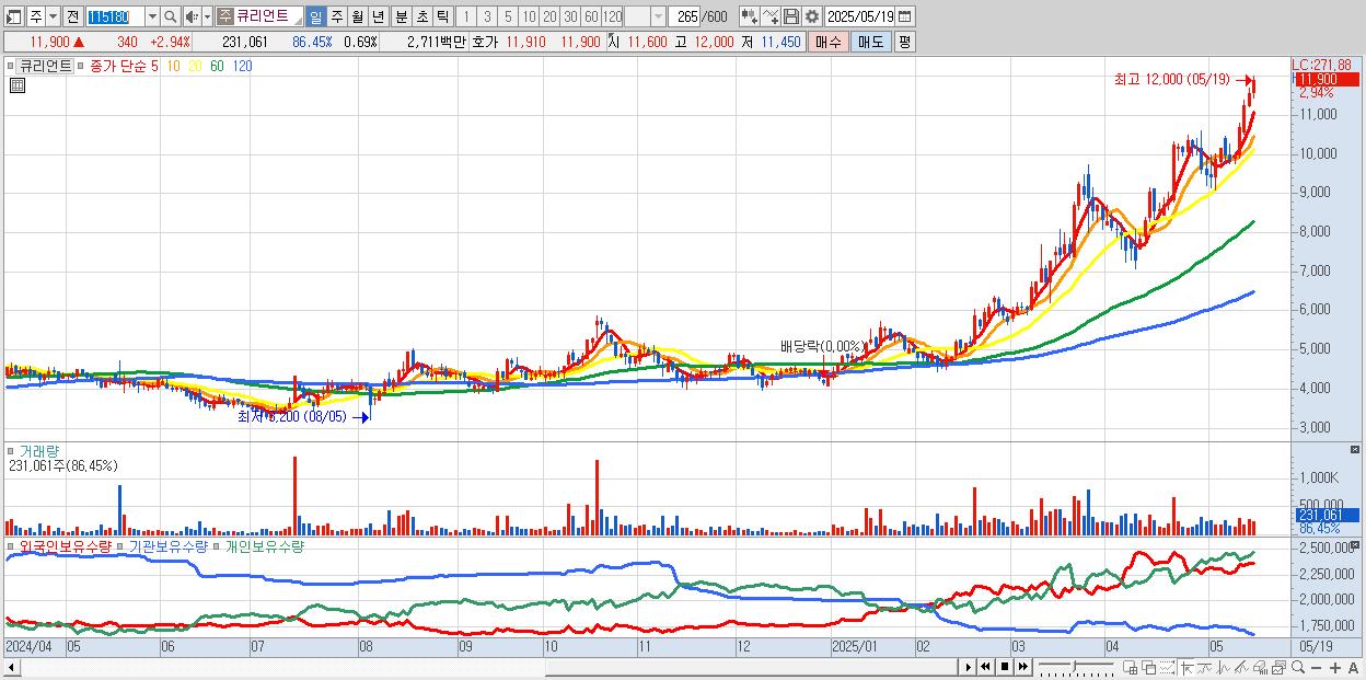 - 큐리언트 (11,900원 ▲ 2.94% , 시총: 4,013억, 거래량: 231,061, 거래대금:27억, KOSDAQ)