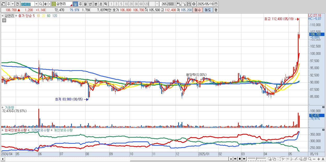 - 삼천리 (106,500원 ▲ 0.95% , 시총: 4,319억, 거래량: 48,784, 거래대금:53억, KOSPI)