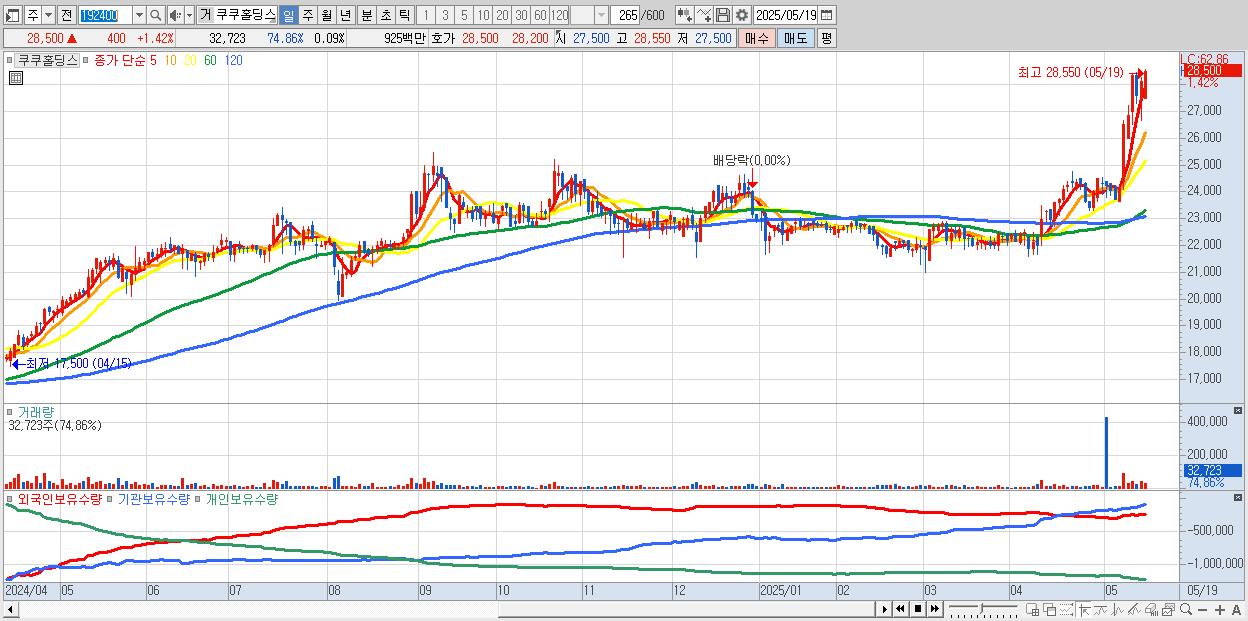 - 쿠쿠홀딩스 (28,500원 ▲ 1.42% , 시총: 10,135억, 거래량: 32,723, 거래대금:9억, KOSPI)