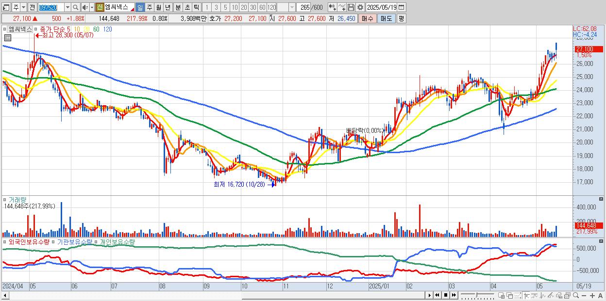 - 엠씨넥스 (27,100원 ▲ 1.88% , 시총: 4,872억, 거래량: 81,136, 거래대금:22억, KOSPI)
