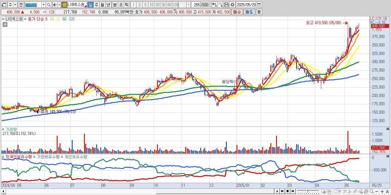 - LIG넥스원 (405,500원 ▲ 0.87% , 시총: 89,210억, 외국인 순매수 거래금:63억)