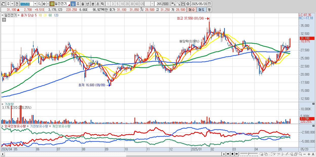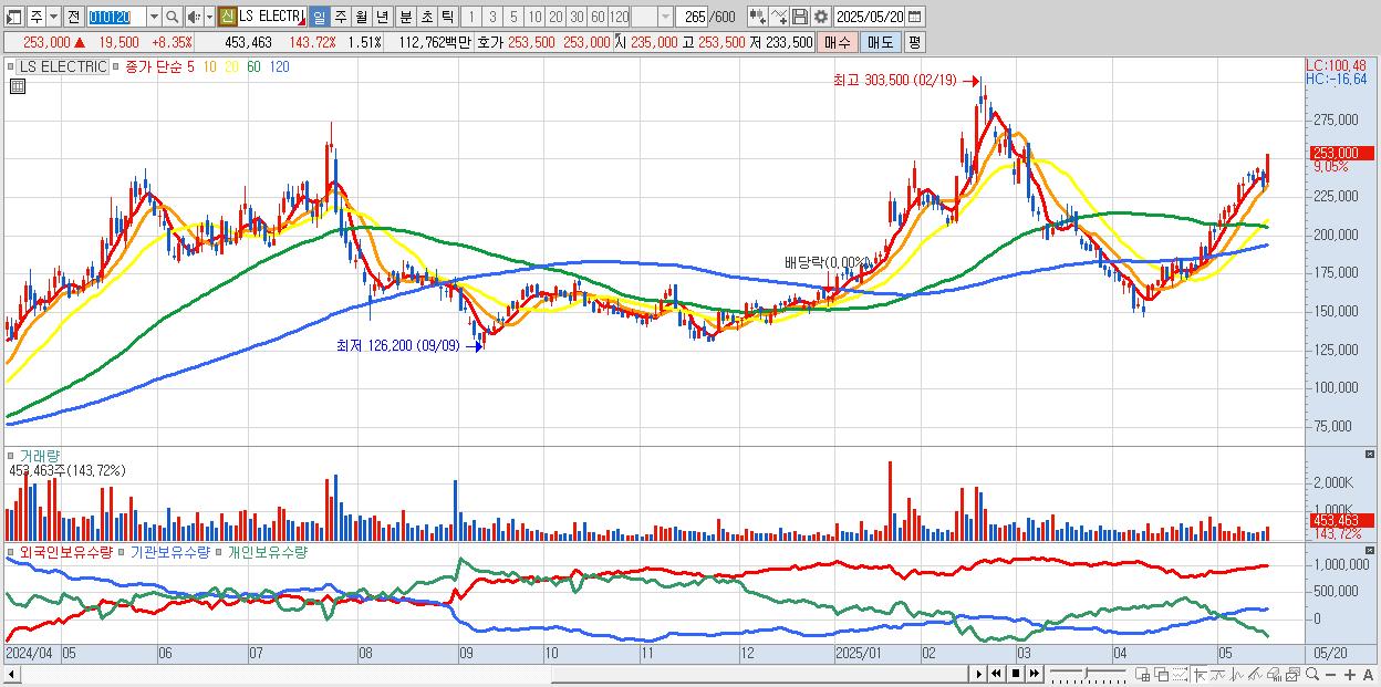 - LS ELECTRIC (252,500원 ▲ 8.14% , 시총: 75,750억, 외국인 순매수 거래금:131억)