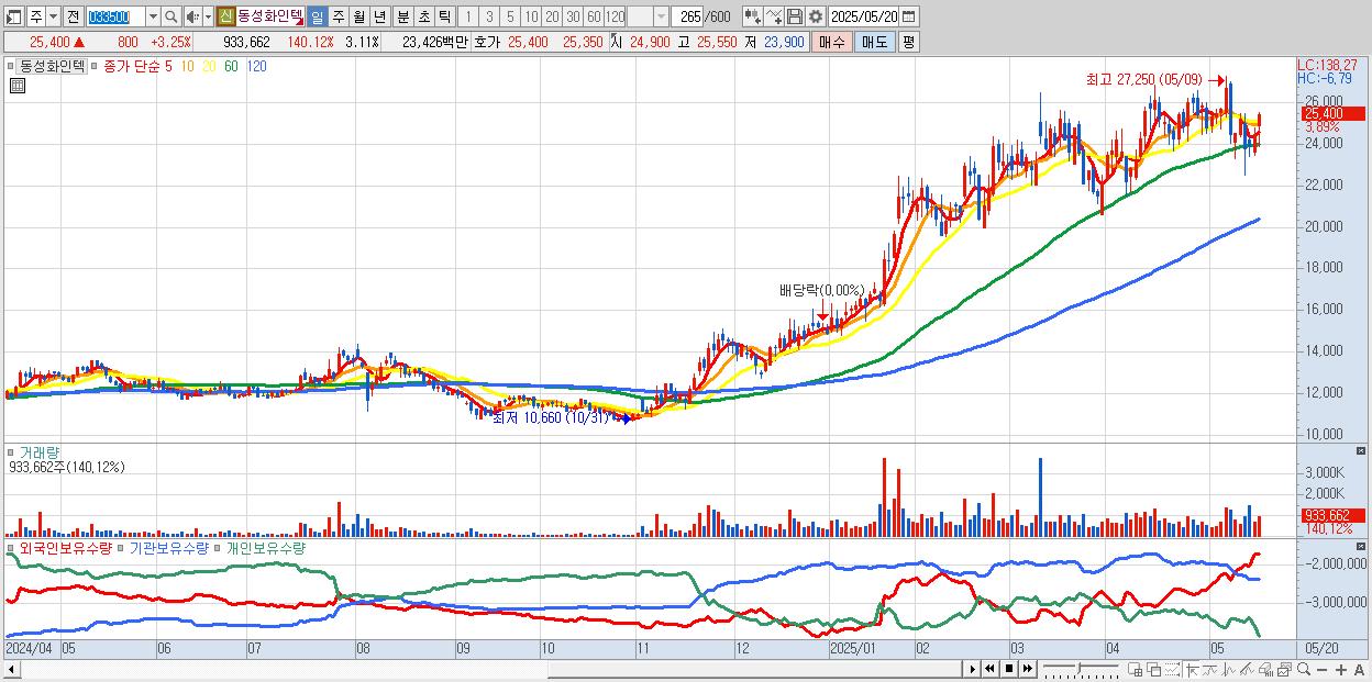 - 동성화인텍 (25,450원 ▲ 3.46% , 시총: 7,632억, 외국인 순매수 거래금:72억)