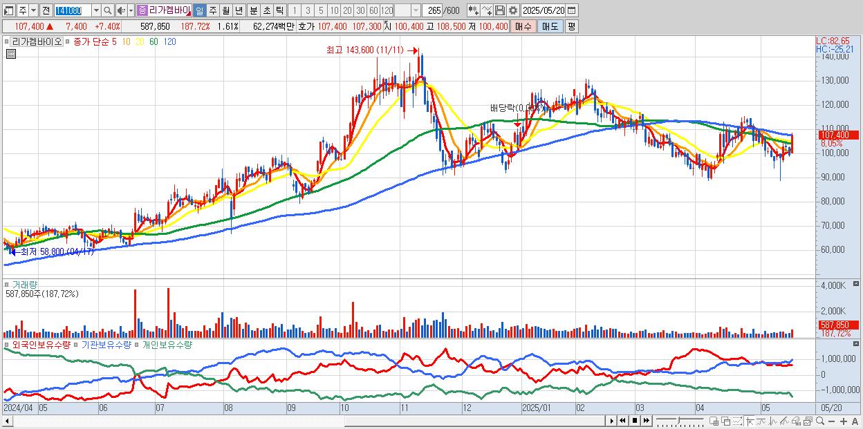 - 리가켐바이오 (107,500원 ▲ 7.5% , 시총: 39,356억, 외국인 순매수 거래금:90억)