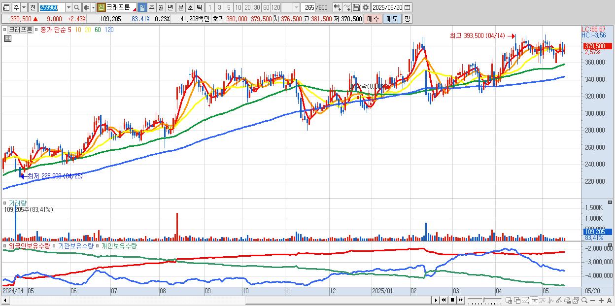 - 크래프톤 (379,500원 ▲ 2.43% , 시총: 181,850억, 외국인 순매수 거래금:92억)
