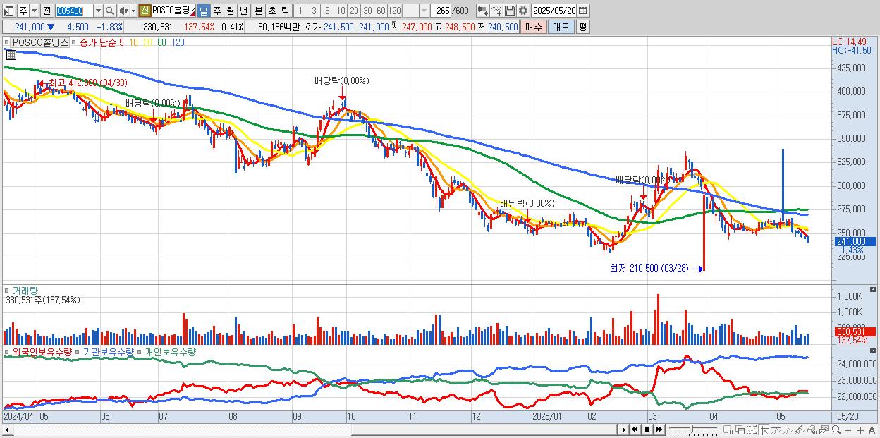 - POSCO홀딩스 (241,000원 ▼ -1.83% , 시총: 195,048억, 외국인 순매수 거래금:50억)