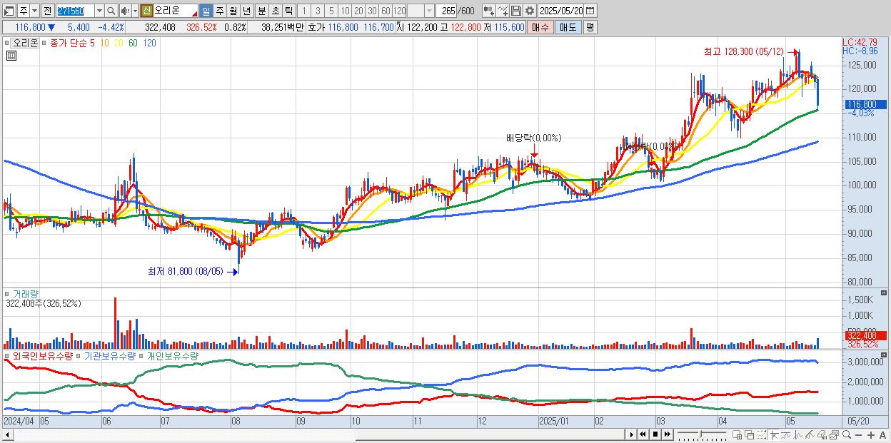 - 오리온 (116,900원 ▼ -4.34% , 시총: 46,218억, 외국인 순매수 거래금:103억)