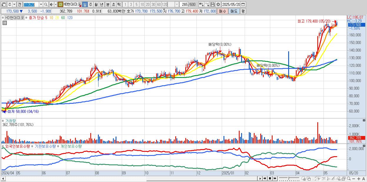 - HD현대미포 (173,500원 ▼ -1.98% , 시총: 69,300억, 외국인 순매수 거래금:87억)