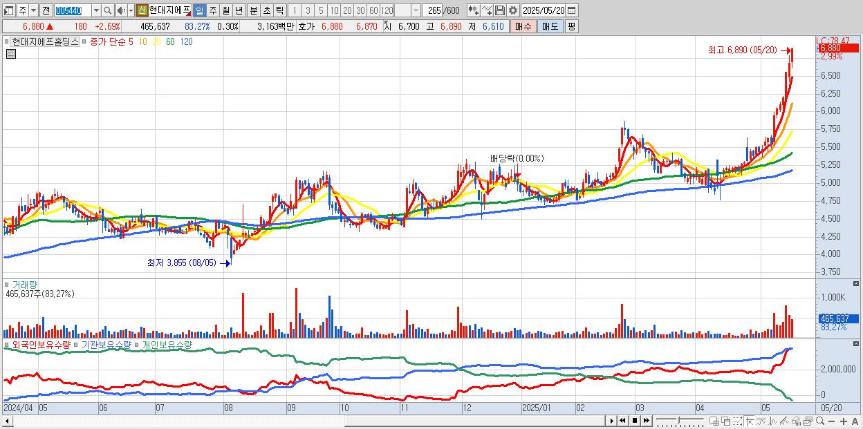 - 현대지에프홀딩스 (6,850원 ▲ 2.24% , 시총: 10,679억, 거래량: 357,833, 거래대금:24억, KOSPI)