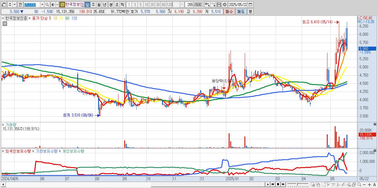 - 한국정보인증 (5,560원 ▼ -1.59% , 시총: 2,360억, 거래량: 15,131,356, 거래대금:918억)