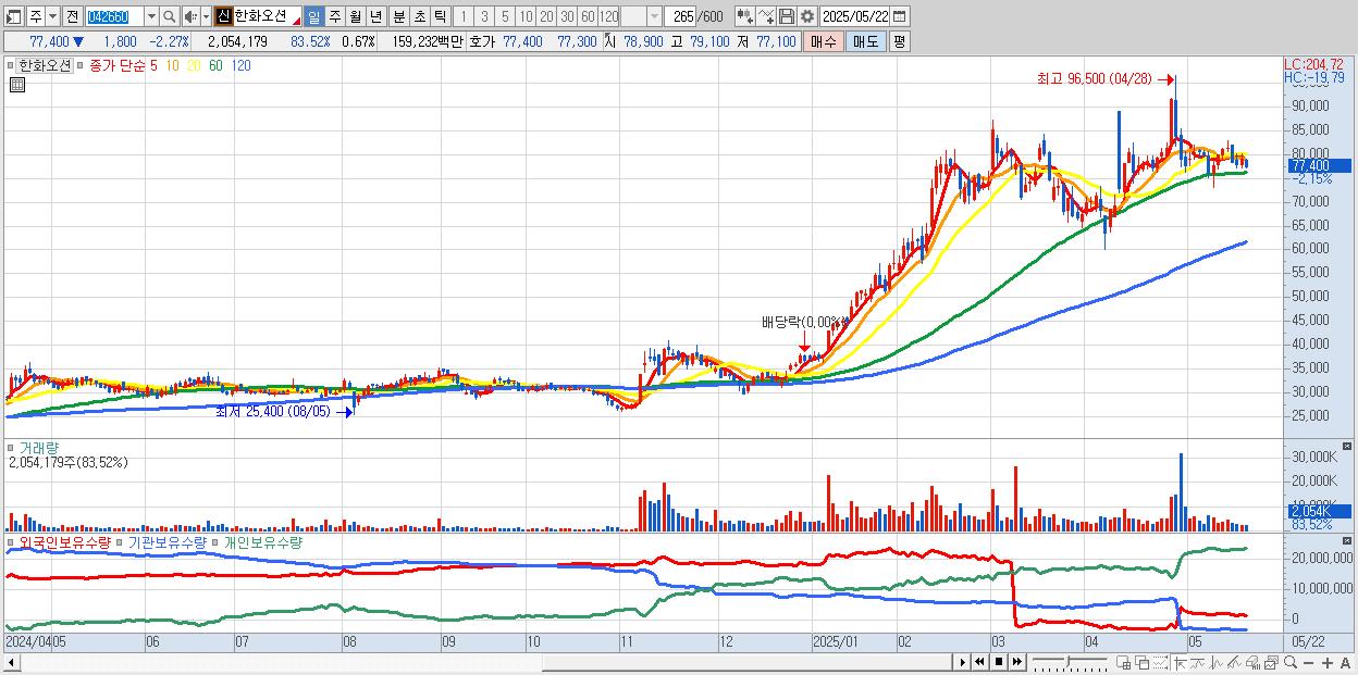 - 한화오션 (77,300원 ▼ -2.4% , 시총: 236,858억, 거래량: 1,162,756, 거래대금:901억)