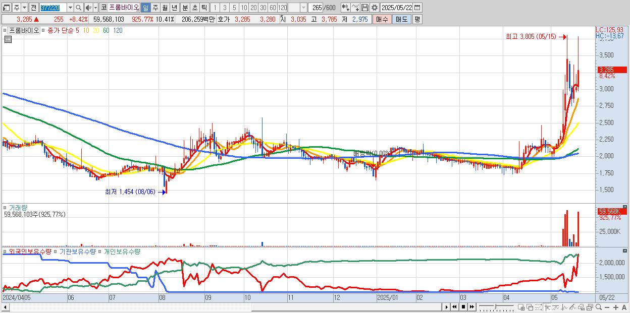 - 프롬바이오 (3,285원 ▲ 8.42% , 시총: 930억, 거래량: 59,568,103, 거래대금:2,063억)