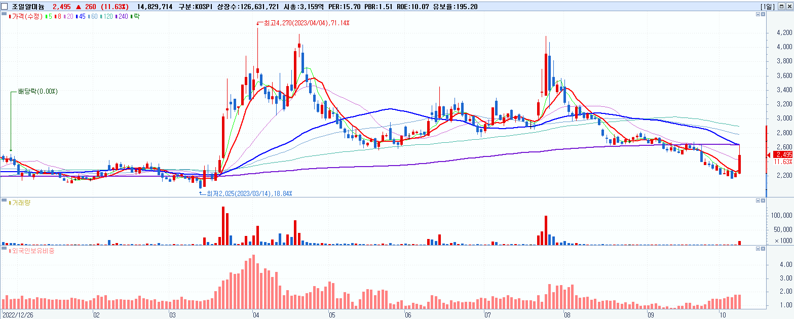 - 조일알미늄 (2,495원 ▲ 11.63% , 시총: 3,159억, 거래량: 14,895,039, 거래대금:374억)