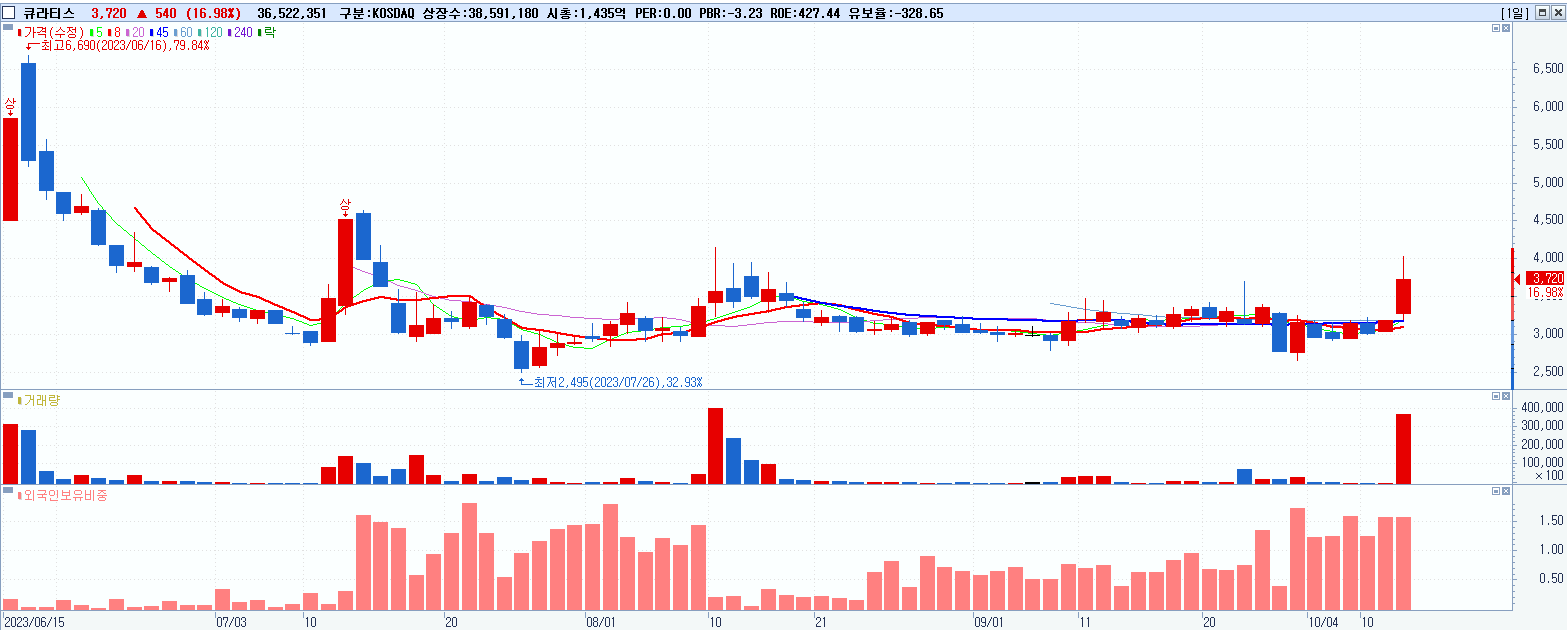 - 큐라티스 (3,720원 ▲ 16.98% , 시총: 1,436억, 거래량: 36,661,675, 거래대금:1,368억)