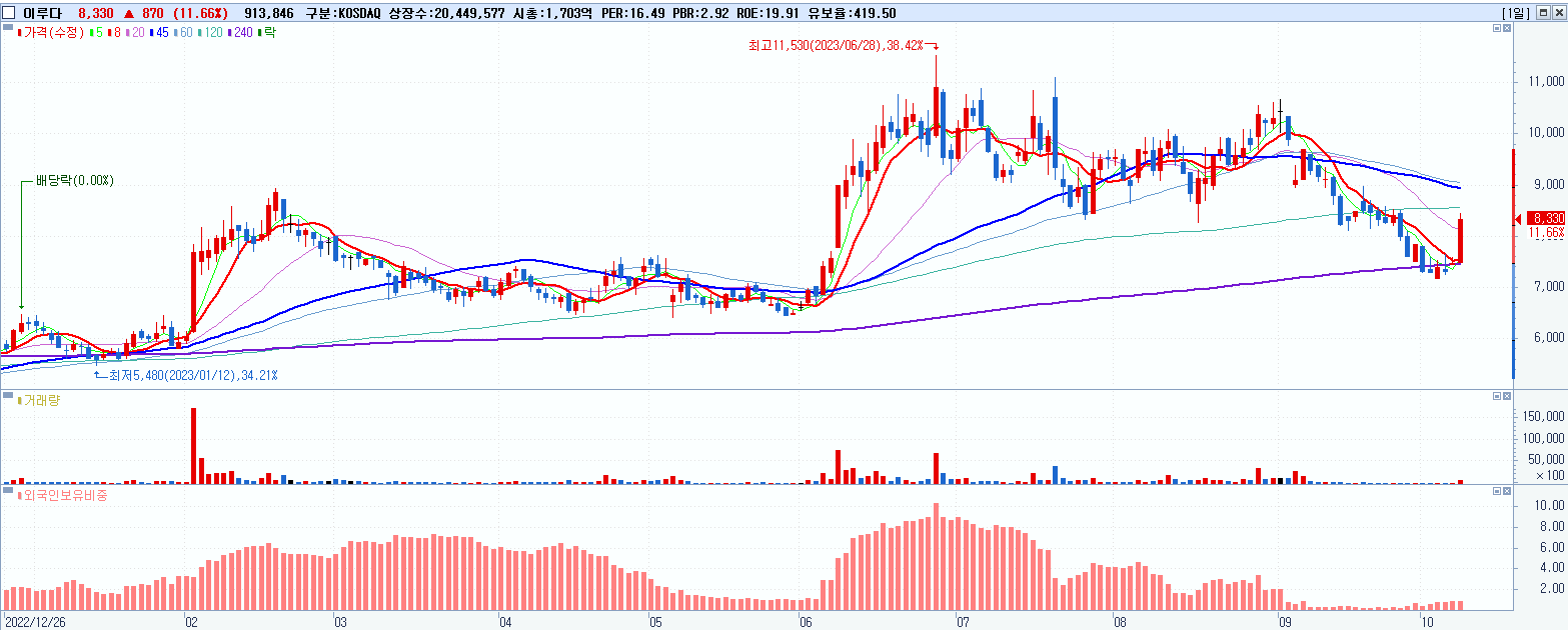 - 이루다 (8,330원 ▲ 11.66% , 시총: 1,703억, 거래량: 914,158, 거래대금:75억)
