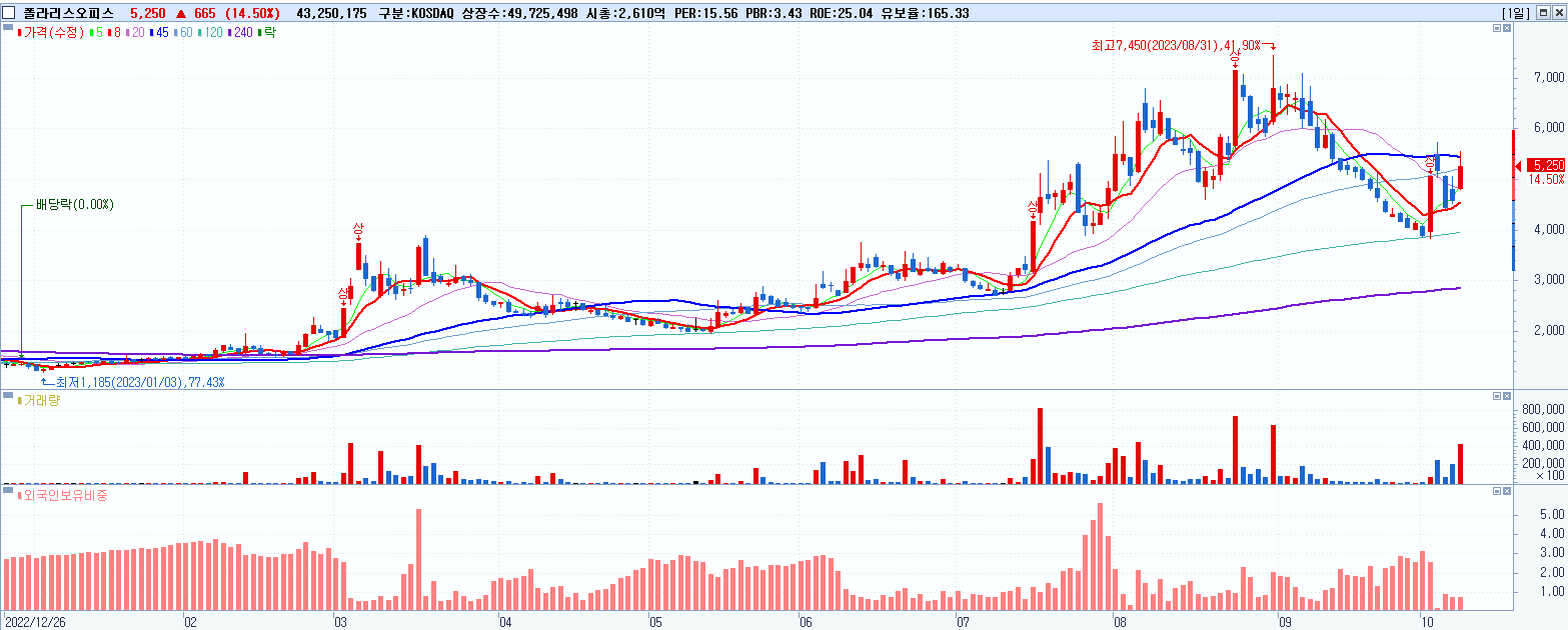 - 폴라리스오피스 (5,250원 ▲ 14.5% , 시총: 2,611억, 거래량: 43,339,061, 거래대금:2,252억)