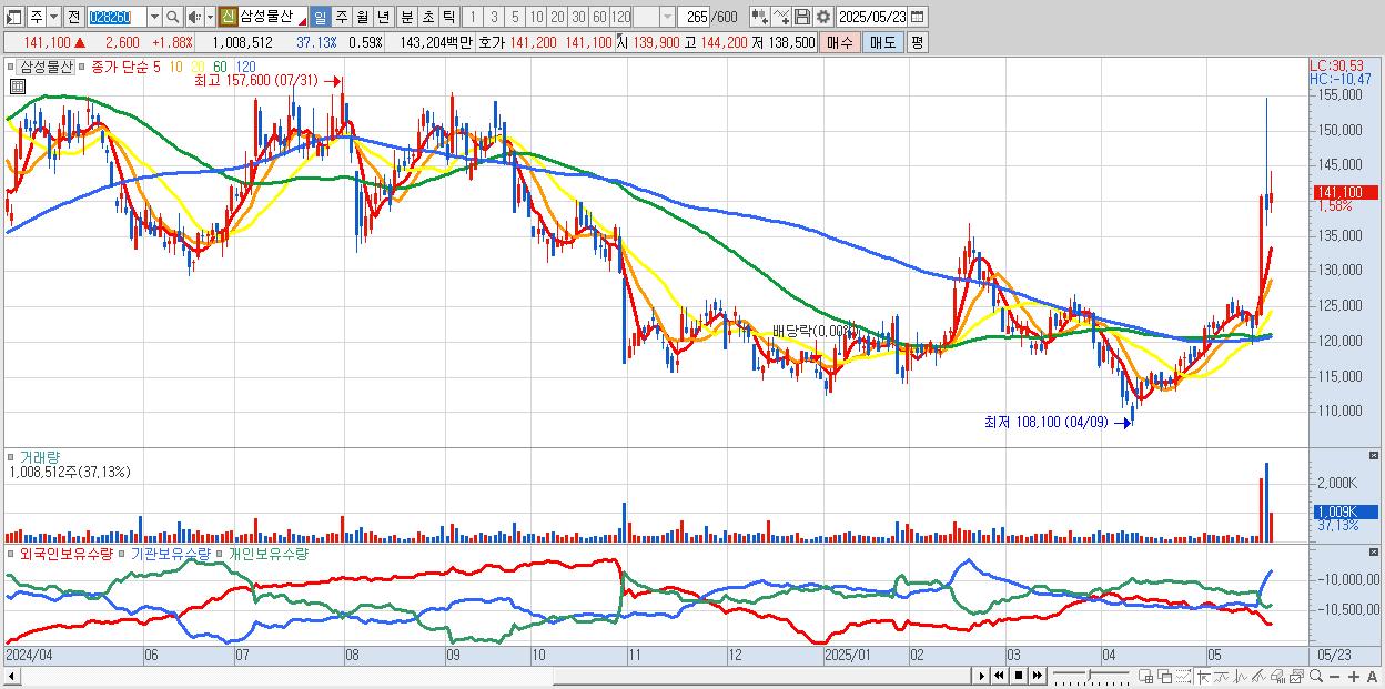 - 삼성물산 (142,000원 ▲ 2.53% , 시총: 241,367억, 거래량: 782,665, 거래대금:1,112억)