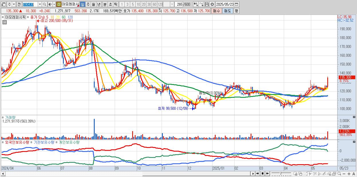 - 아모레퍼시픽 (135,300원 ▲ 8.24% , 시총: 79,141억, 거래량: 918,055, 거래대금:1,225억)