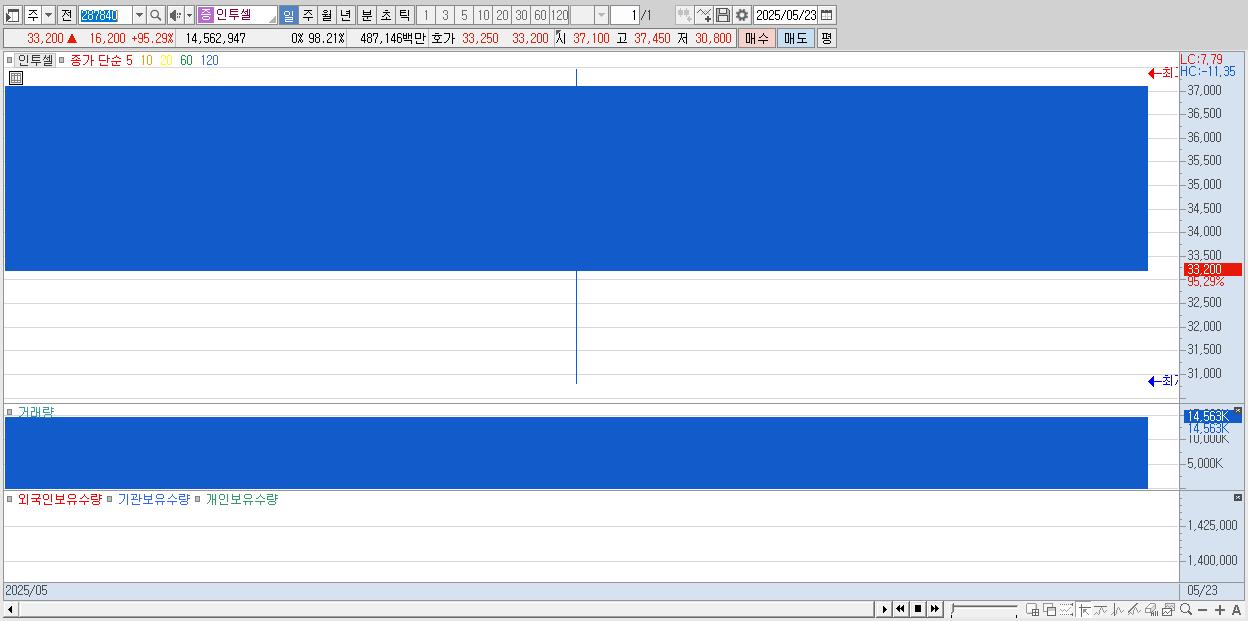 - 인투셀 (33,200원 ▲ 95.29% , 시총: 4,923억, 거래량: 14,562,947, 거래대금:4,871억)