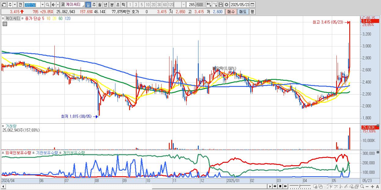 - 케이씨티 (3,415원 ▲ 29.85% , 시총: 586억, 거래량: 25,062,943, 거래대금:779억)