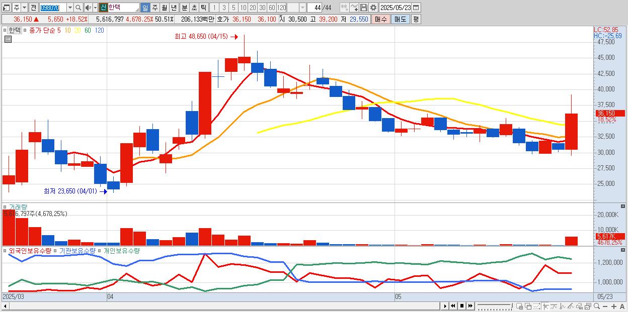- 한텍 (36,150원 ▲ 18.52% , 시총: 4,020억, 거래량: 5,616,797, 거래대금:2,061억)