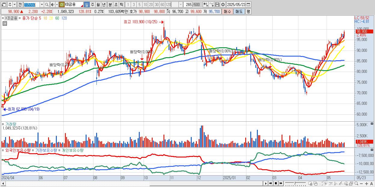 - KB금융 (99,000원 ▲ 2.38% , 시총: 389,593억, 거래량: 939,884, 거래대금:928억)