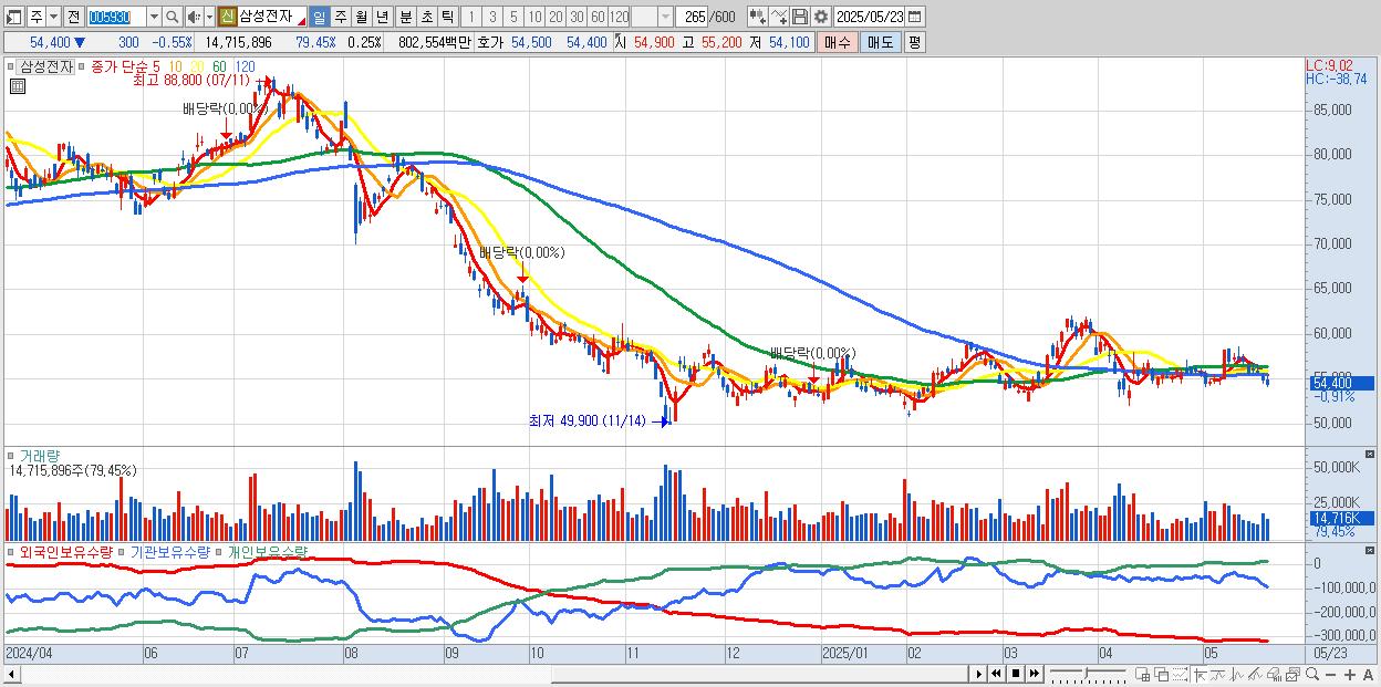 - 삼성전자 (54,200원 ▼ -0.91% , 시총: 3,208,444억, 거래량: 11,247,115, 거래대금:6,132억)