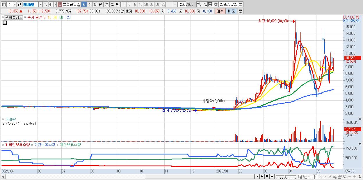- 평화홀딩스 (10,350원 ▲ 12.5% , 시총: 1,514억, 거래량: 9,776,957, 거래대금:980억)