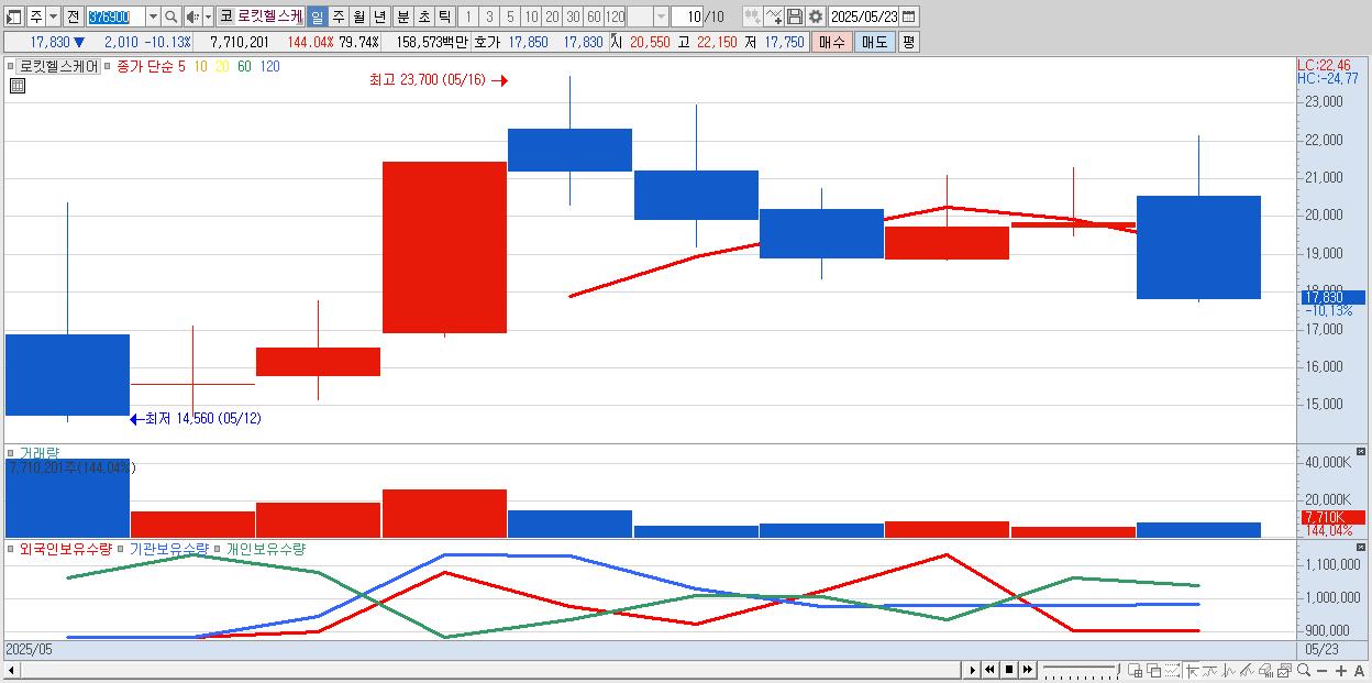 - 로킷헬스케어 (17,830원 ▼ -10.13% , 시총: 1,724억, 거래량: 7,710,201, 거래대금:1,586억)