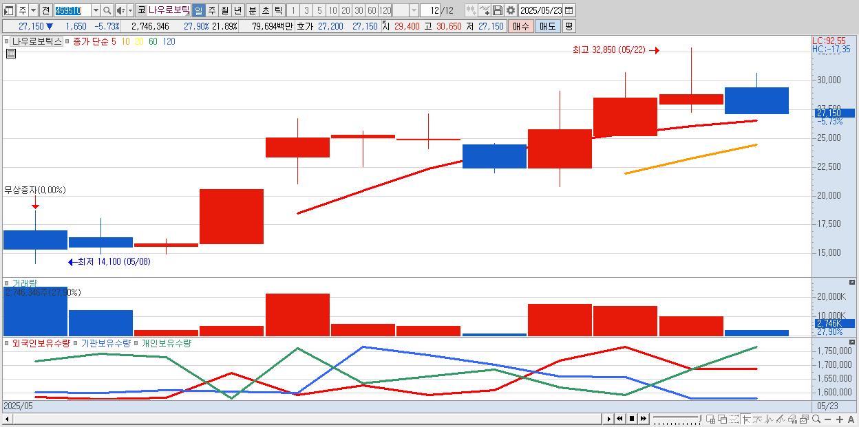 - 나우로보틱스 (27,150원 ▼ -5.73% , 시총: 3,407억, 거래량: 2,746,346, 거래대금:797억)