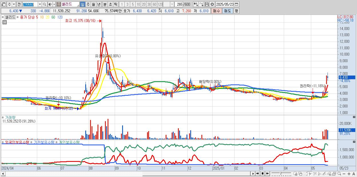 - 셀리드 (6,430원 ▼ -4.88% , 시총: 1,357억, 거래량: 11,539,252, 거래대금:756억)