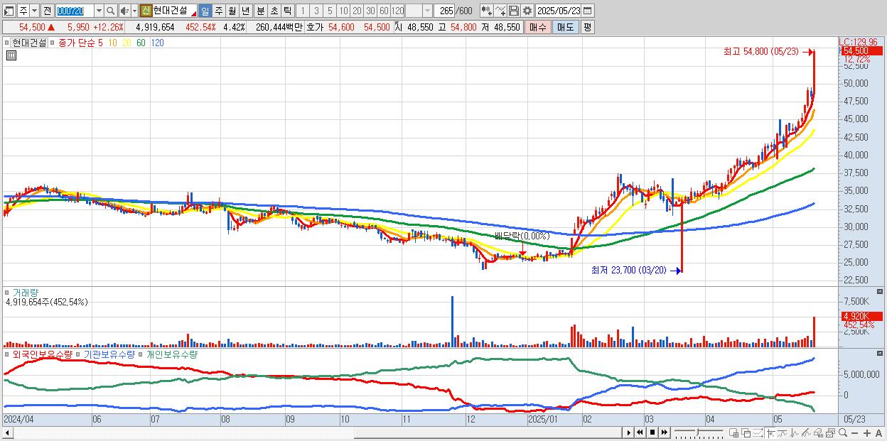 - 현대건설 (54,200원 ▲ 11.64% , 시총: 60,355억, 거래량: 3,323,088, 거래대금:1,760억)