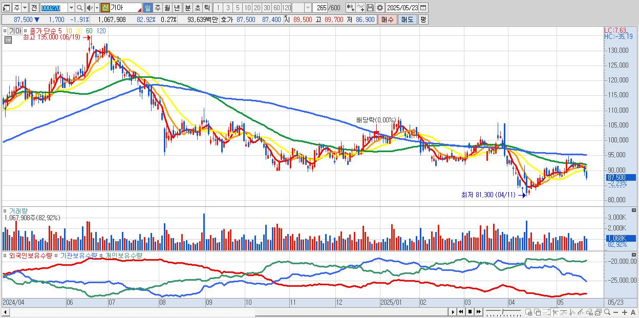 - 기아 (87,100원 ▼ -2.35% , 시총: 346,373억, 거래량: 879,529, 거래대금:771억)