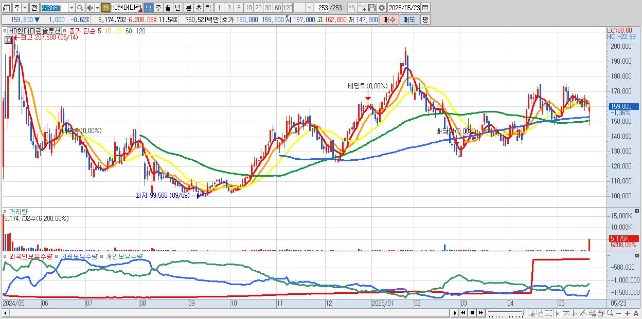 - HD현대마린솔루션 (160,300원 ▼ -0.31% , 시총: 71,861억, 거래량: 5,064,882, 거래대금:7,436억)