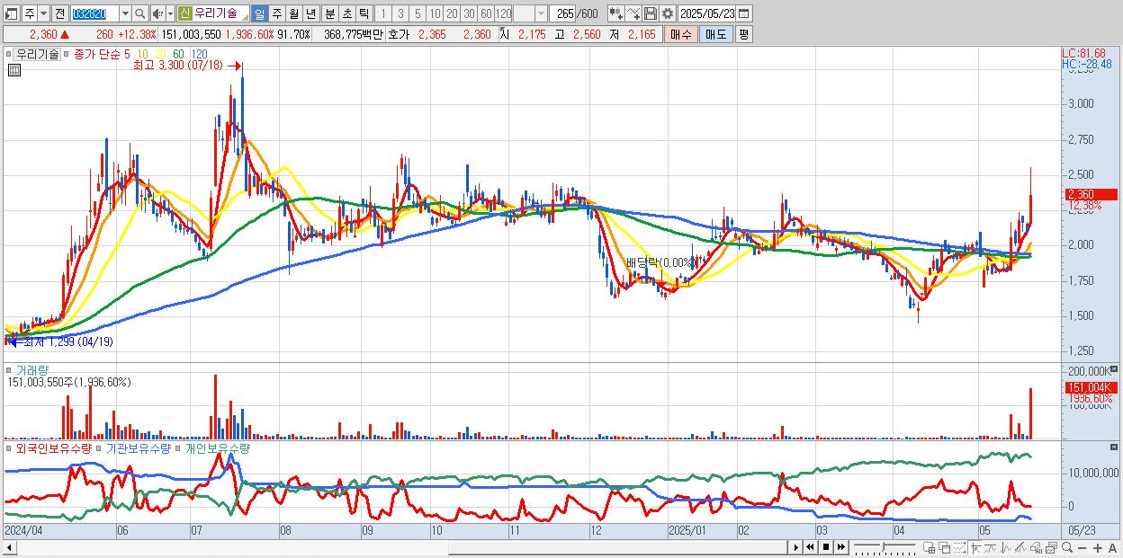 - 우리기술 (2,360원 ▲ 12.38% , 시총: 3,886억, 거래량: 151,003,550, 거래대금:3,688억)