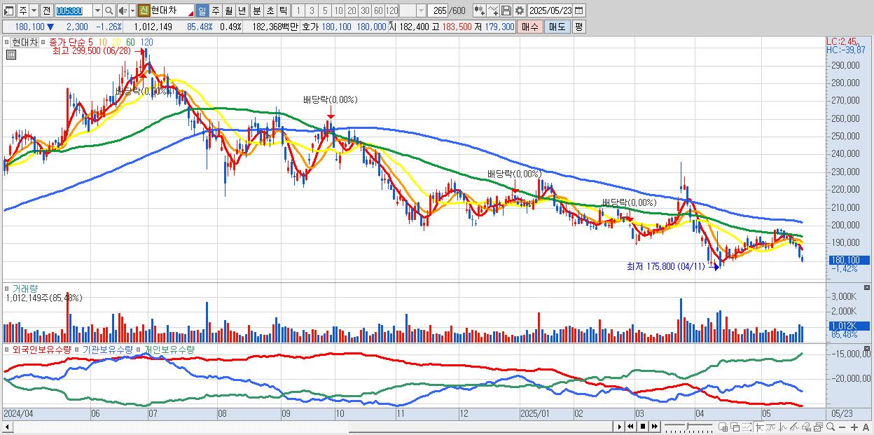 - 현대차 (179,900원 ▼ -1.37% , 시총: 368,359억, 거래량: 829,741, 거래대금:1,494억)