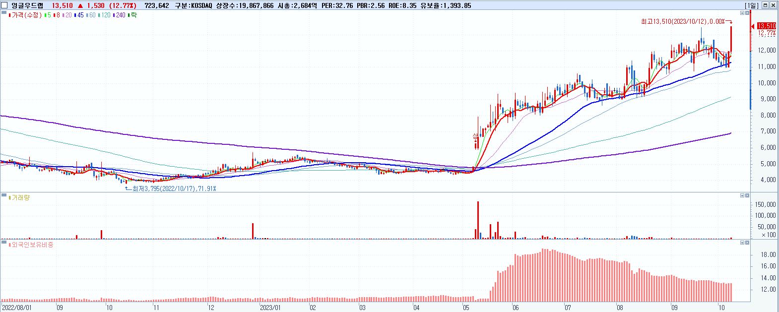 - 잉글우드랩 (13,510원 ▲ 12.77% , 시총: 2,684억, 거래량: 725,210, 거래대금:95억, KOSDAQ)