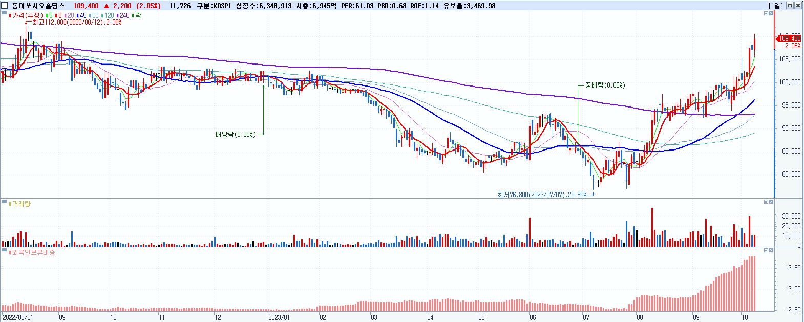 동아쏘시오홀딩스 109,400원 ▲ 2.05% (KOSPI, 000640)