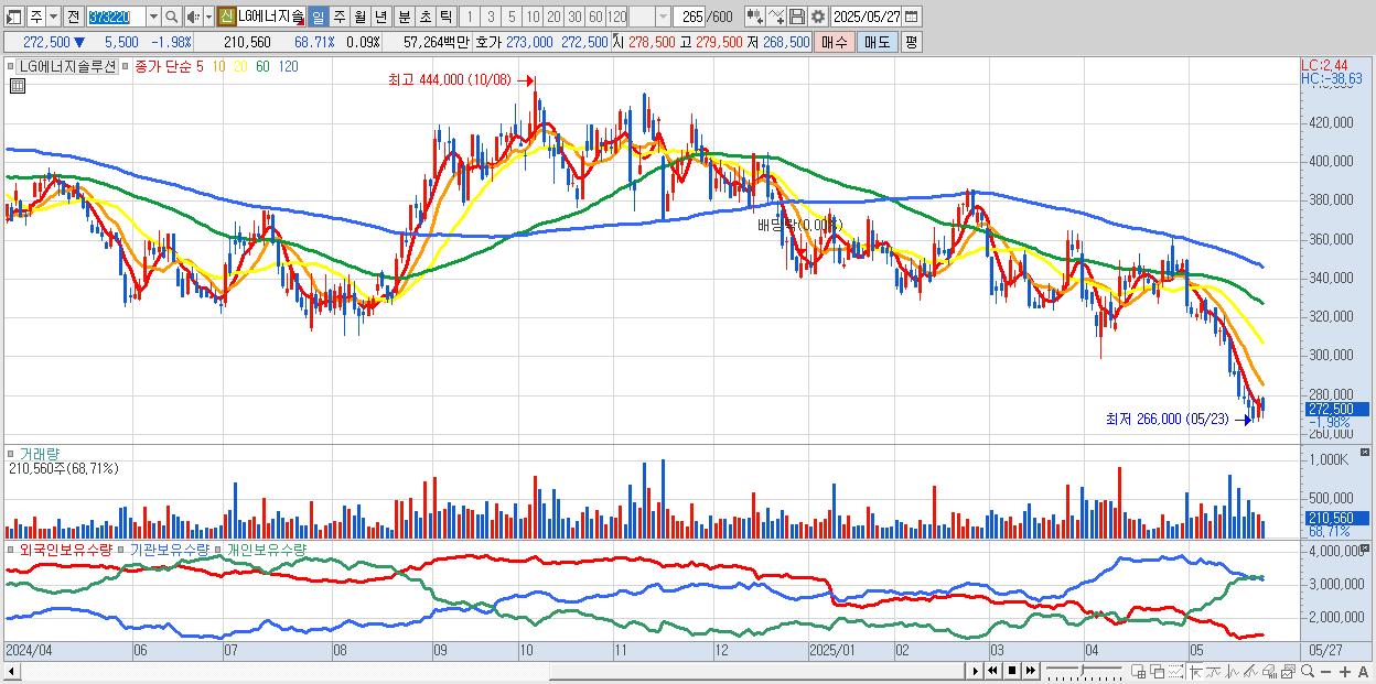 - LG에너지솔루션 (272,500원 ▼ -1.98% , 시총: 637,650억, 외국인 순매수 거래금:70억)