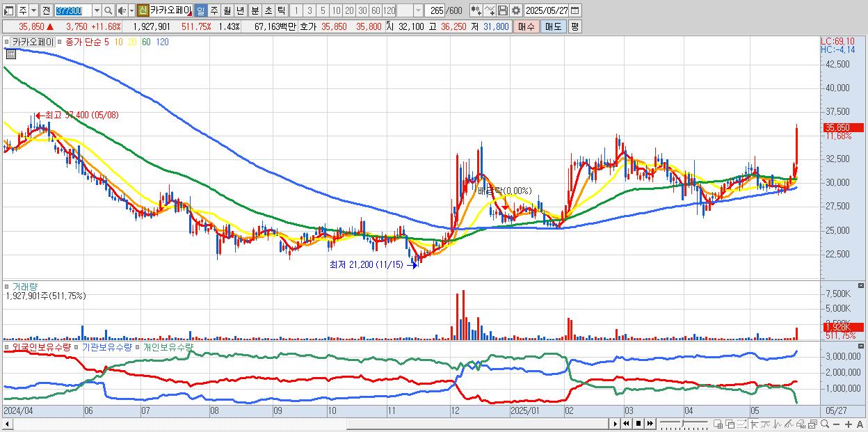 - 카카오페이 (35,950원 ▲ 11.99% , 시총: 48,422억, 외국인 순매수 거래금:155억)